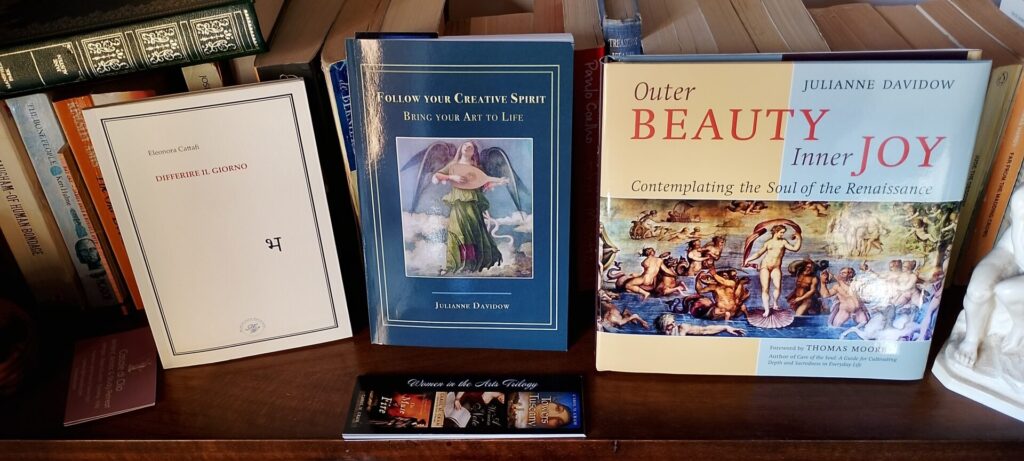 A number of books were also gifted onto our bookshelves by guests, including an anthology of poetry from Eleonora Cattafi, our first guest of 2025, and a couple of lovely books from Julianne Davidow – see the photo below, which also contains the remains of a stack of bookmarks gifted by guest and author Carol M. Cram (with some no-doubt still keeping places in books around the world!).