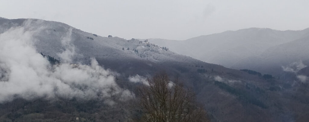 Keeping with the Festive Season theme, here (below) is a photograph taken for Befana Day (Epiphany/12th Night); we are sure that you will remember the lovely and inspiring views from Casale di Clio – but you won’t have seen a chilly view like this (thankfully, our 2025 Festive Season opening provided many lovely sunny days, with our first very light snowfall of Winter 2025/26 arriving just 2 days after our last guest departed!):