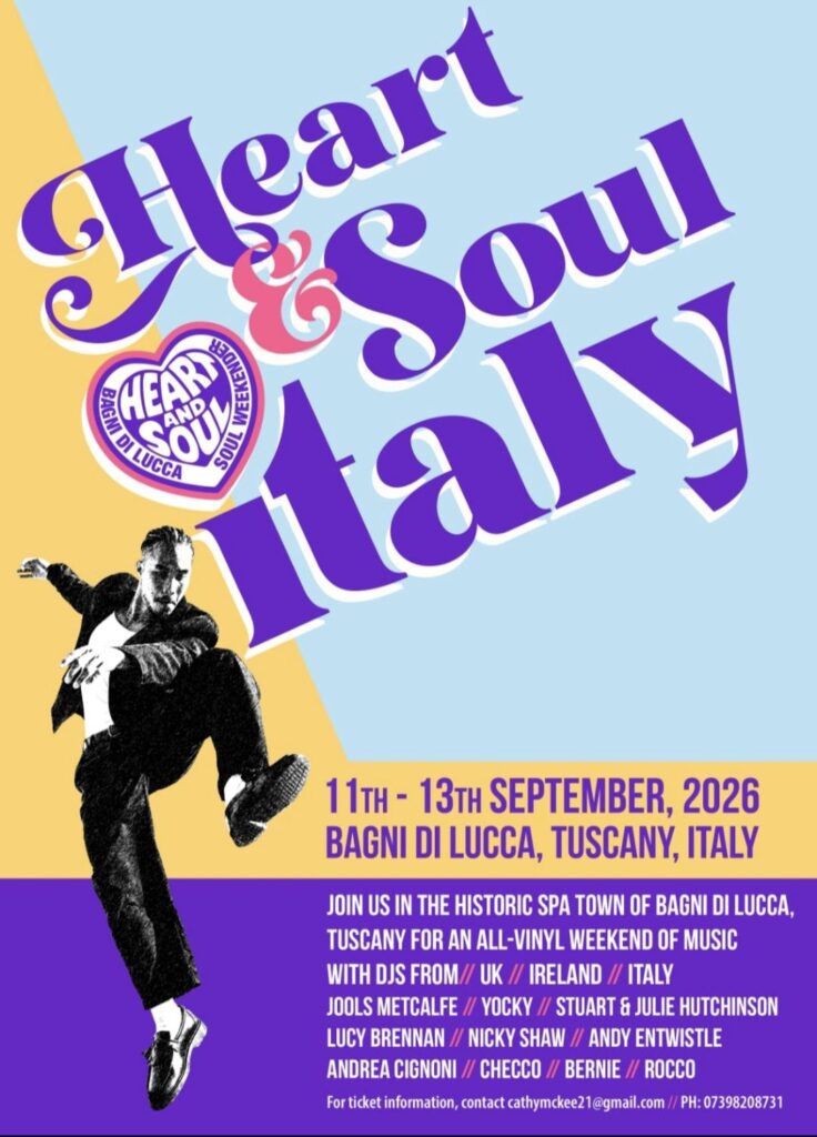 - Bagni di Lucca Soul Weekender – it has now been confirmed that the event will be repeated in September 2026 (Friday 11th – Sunday 13th) – more news on the Bagni di Lucca Soul Weekender facebook page. The event runs over Friday, Saturday, Sunday and we are likely to head down for either Friday or Saturday (when a taxi back can probably be arranged), and maybe the Sunday afternoon session, when we’ll drive down and up. We will maintain our Saturday-Saturday booking pattern here – i.e., it will not be possible to book to stay for 5 days covering the weekend, since this would effectively prevent us from taking full-week bookings on either side of the weekend. If you want to attend the event while staying here then, the choice will be to book the week including the Friday session at the end of it, or the week with the Saturday and Sunday sessions at the start of it (or book to stay both weeks!). Either way, make sure to pack your dancing shoes!